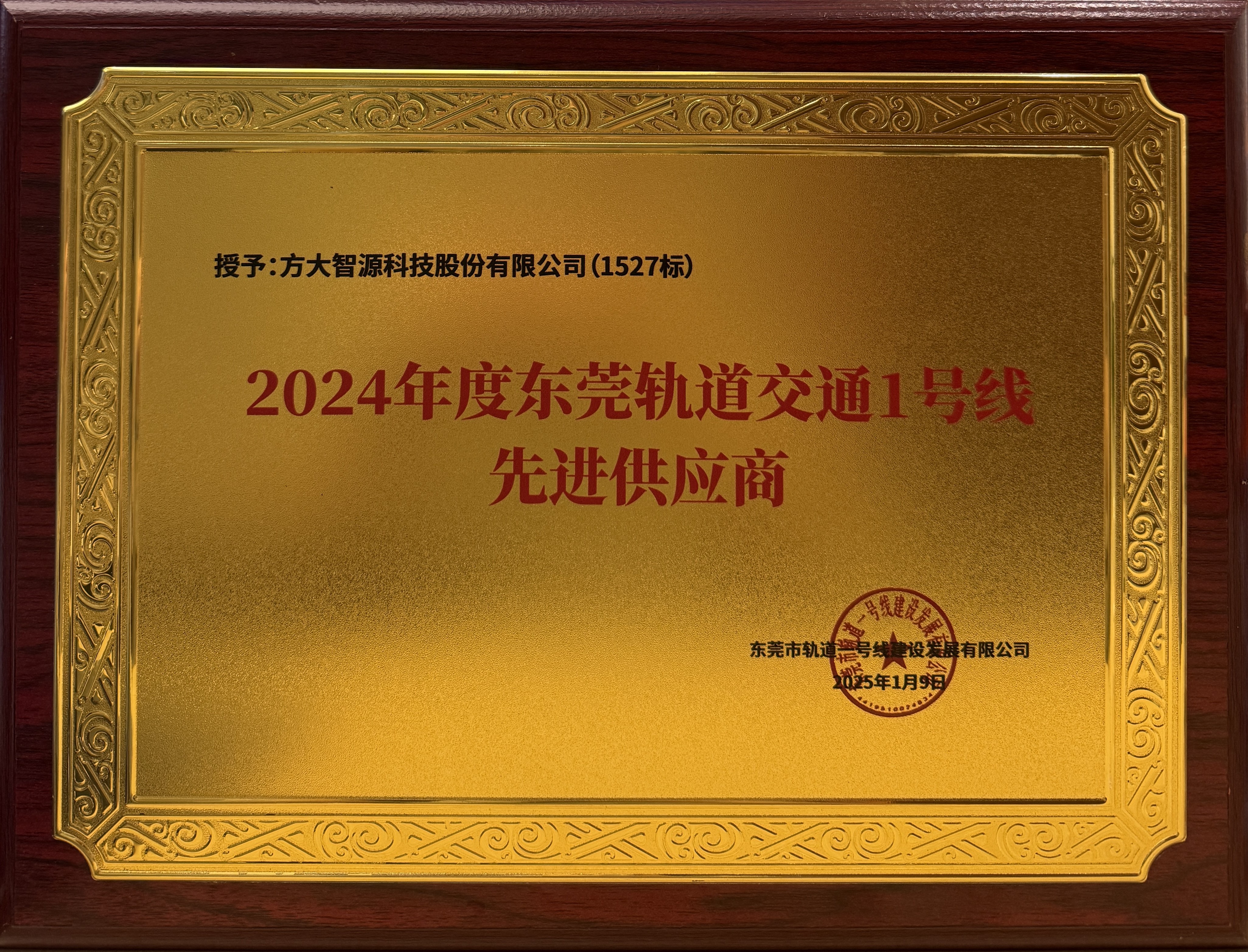 2025年1月,方大智源荣获“2024年度东莞轨道交通1号线先进供应商”。从2024年1月首站测量放线以来,方大智源项目部在精准安装、精确调试和优化等工作中严把质量关、牢守安全底线,确保一流设备保障运营高效可靠,顺利保障实现了综合联调、空载试运行、安全评估等关键节点,为高质量开通保驾护航。