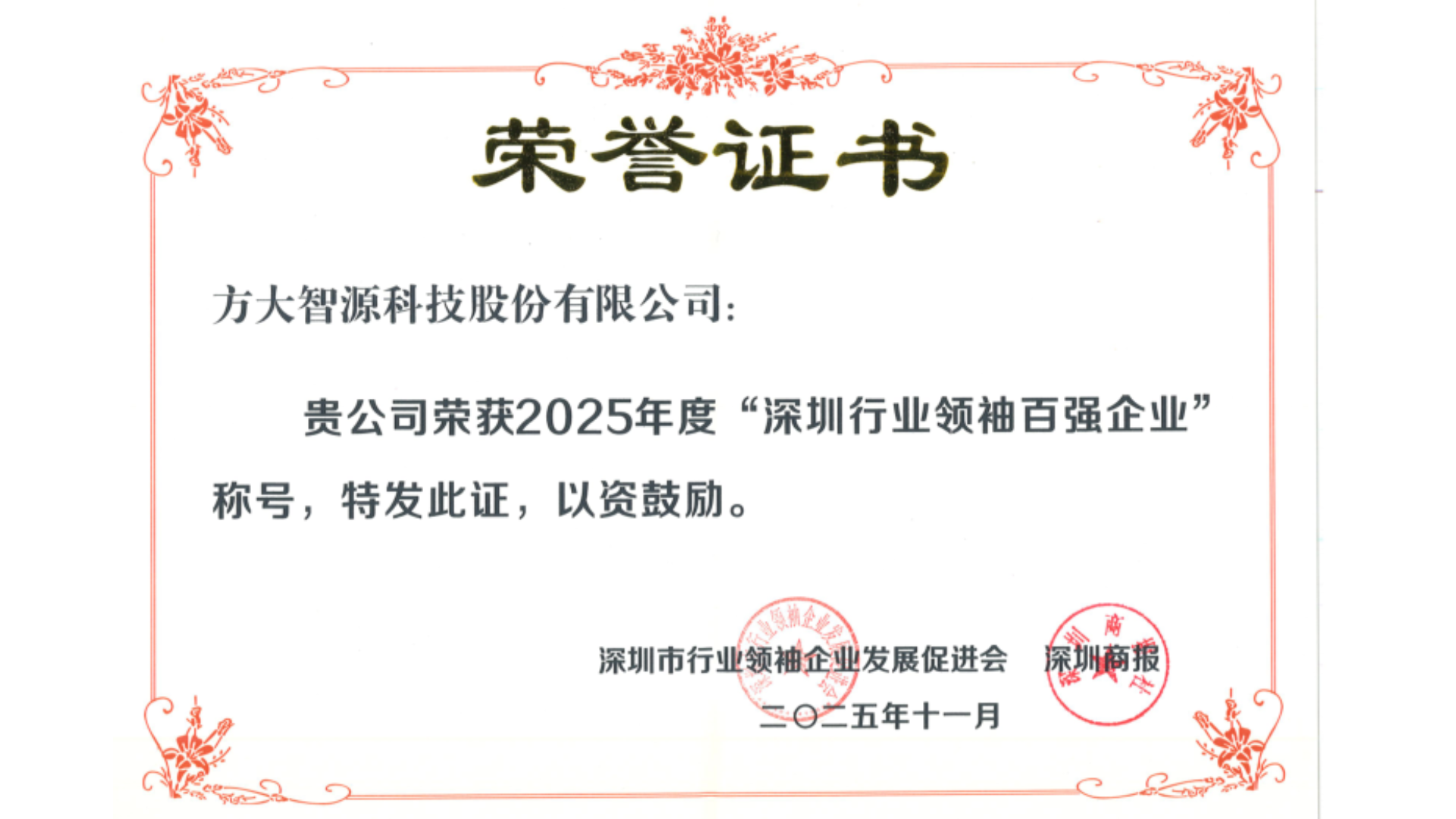 2025年,方大智源连续第七年荣登“2025深圳行业领袖企业100强”榜单,近期受邀参加第七届“书香圳好”深圳行业领袖科技创新生态大会。该榜单评选历时6个月,经深圳市工商业联合会(总商会)、深圳报业集团指导,由深圳市行业领袖企业发展促进会与深圳商报/读创客户端共同发布。入选企业具备精准市场定位、领先市场份额,构建了技术、性能、成本及品牌壁垒,凭借深厚的行业护城河成为标杆典范,对深圳培育优质创新生态和推动行业突破有关键作用。